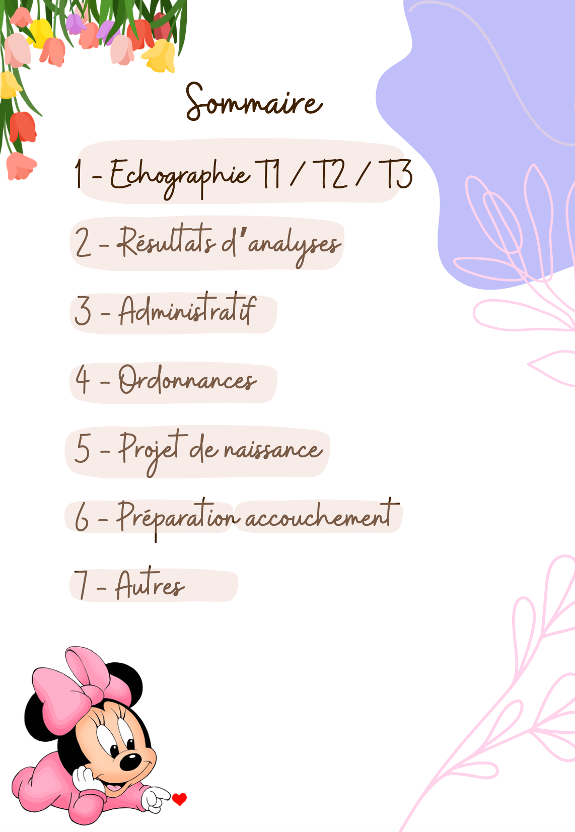 11 pages pour organiser votre classeur de grossesse et classer tous vos documents (échographies, résultats d'analyses, ordonnances, projet de naissance, préparation à l'accouchement, administratif...). Comprends un calendrier de grossesse.