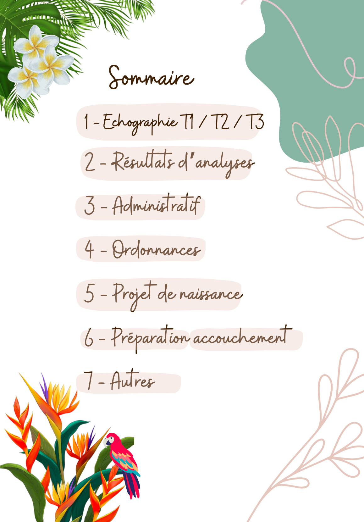 11 pages pour organiser votre classeur de grossesse et classer tous vos documents (échographies, résultats d'analyses, ordonnances, projet de naissance, préparation à l'accouchement, administratif...). Comprends un calendrier de grossesse.