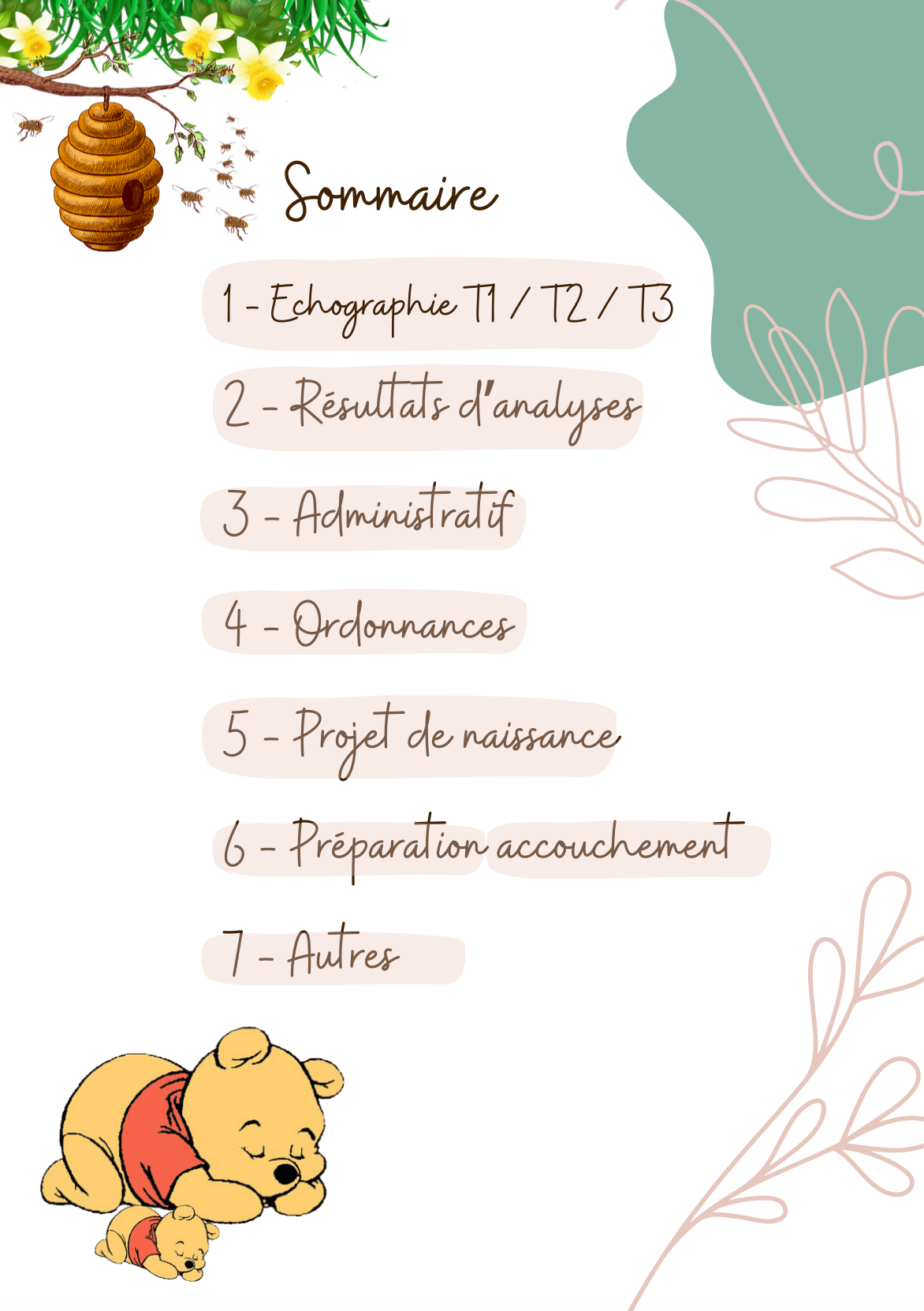 11 pages pour organiser votre classeur de grossesse et classer tous vos documents (échographies, résultats d'analyses, ordonnances, projet de naissance, préparation à l'accouchement, administratif...). Comprends un calendrier de grossesse.